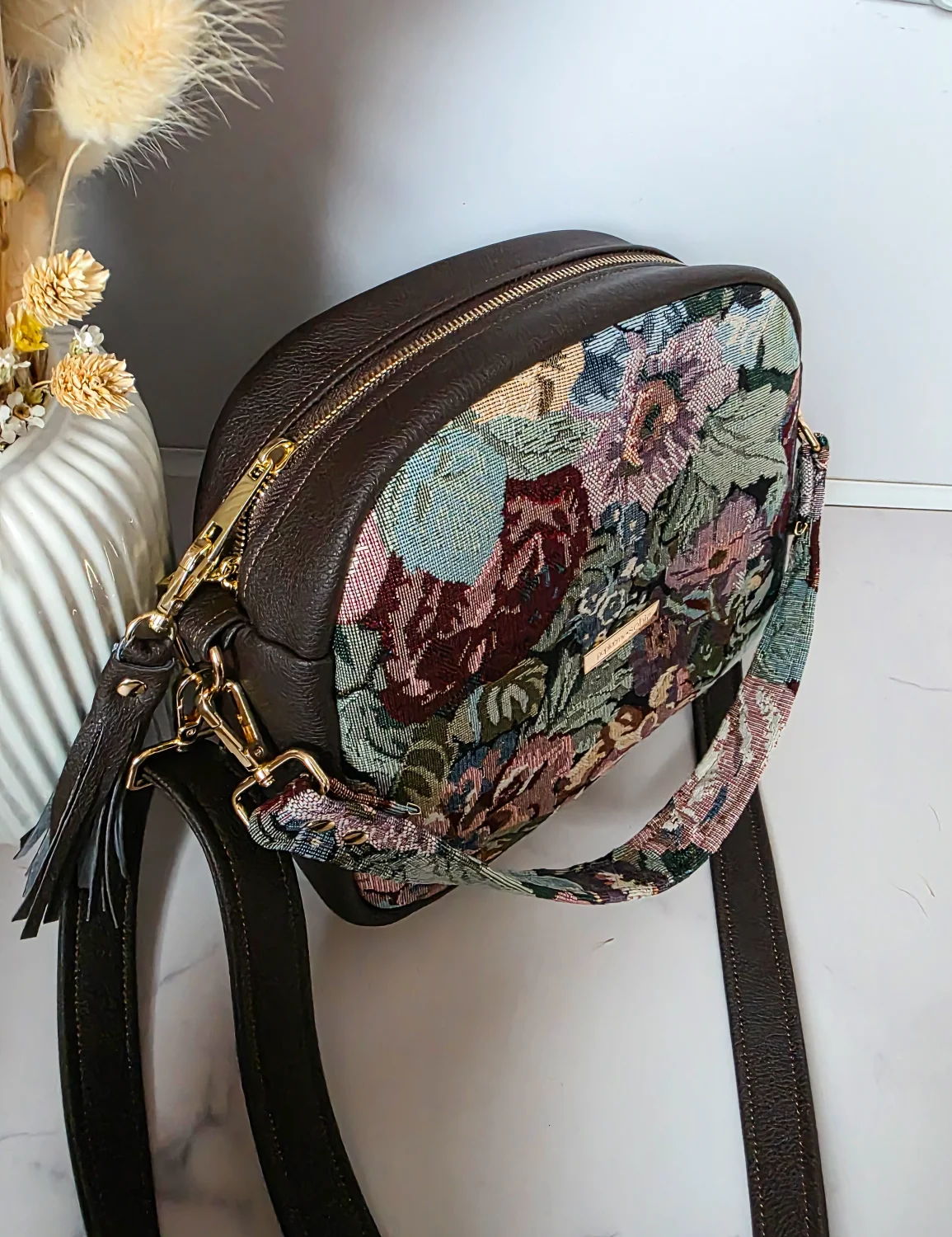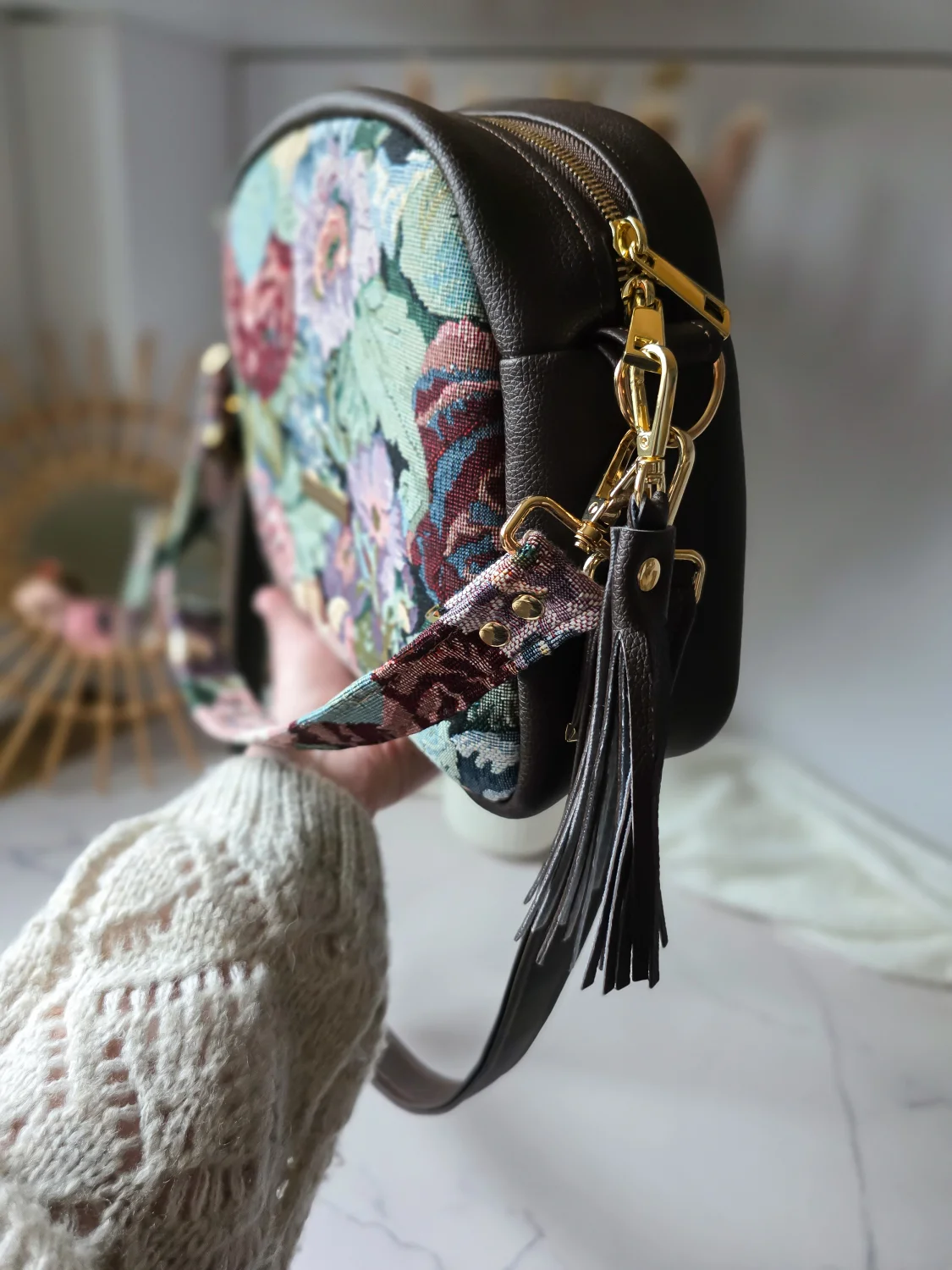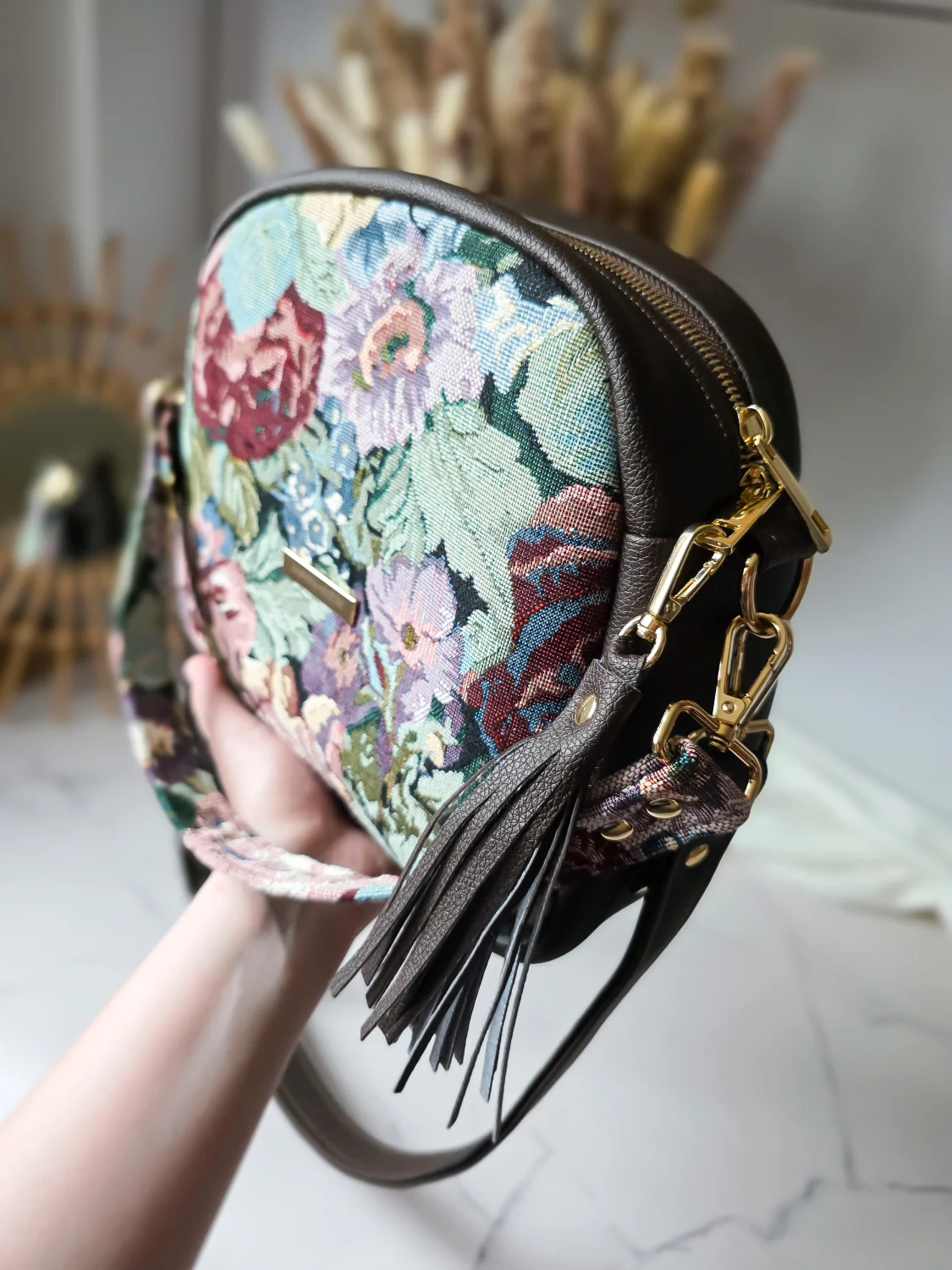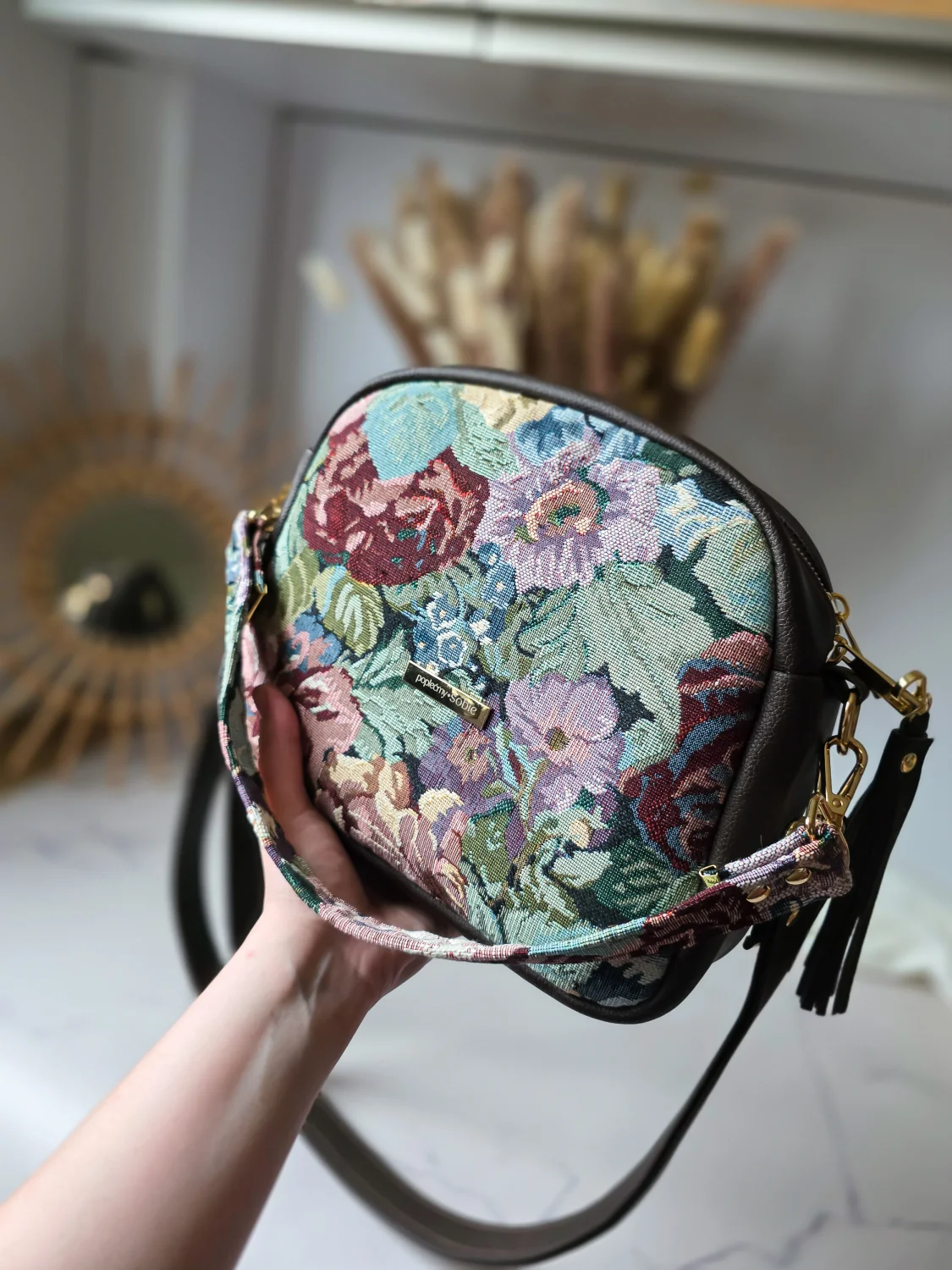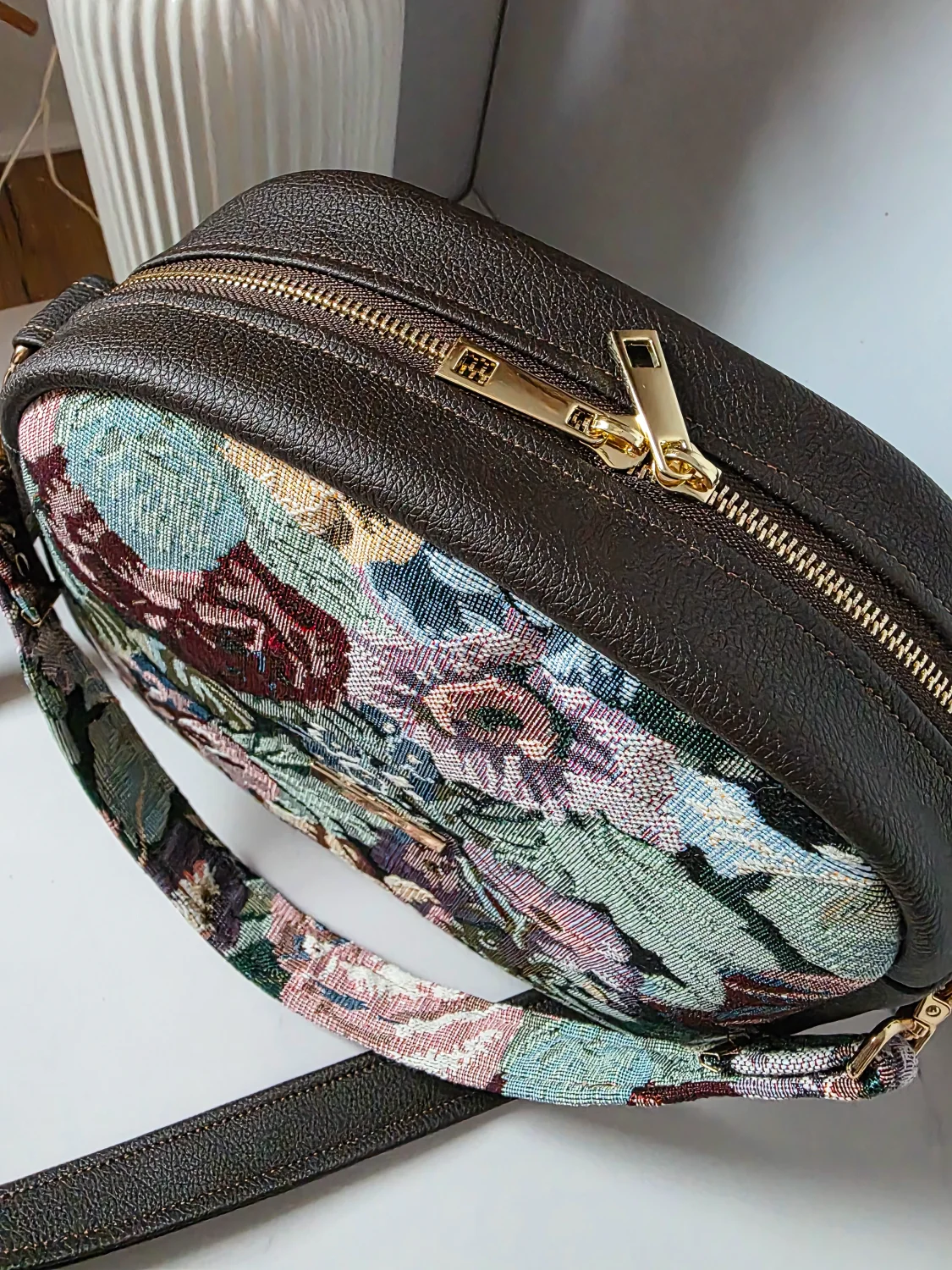 Torebka została uszyta z ekoskory brazowej i tkaniny zakardowej (przód).