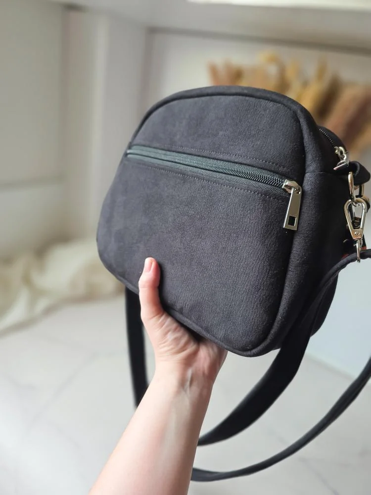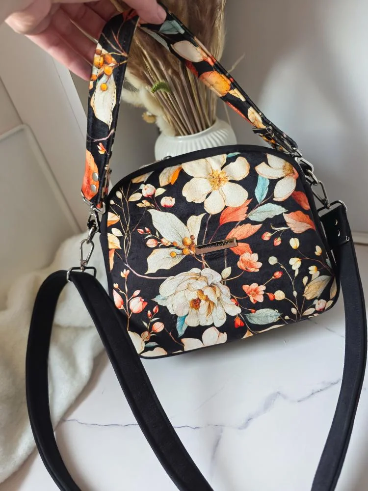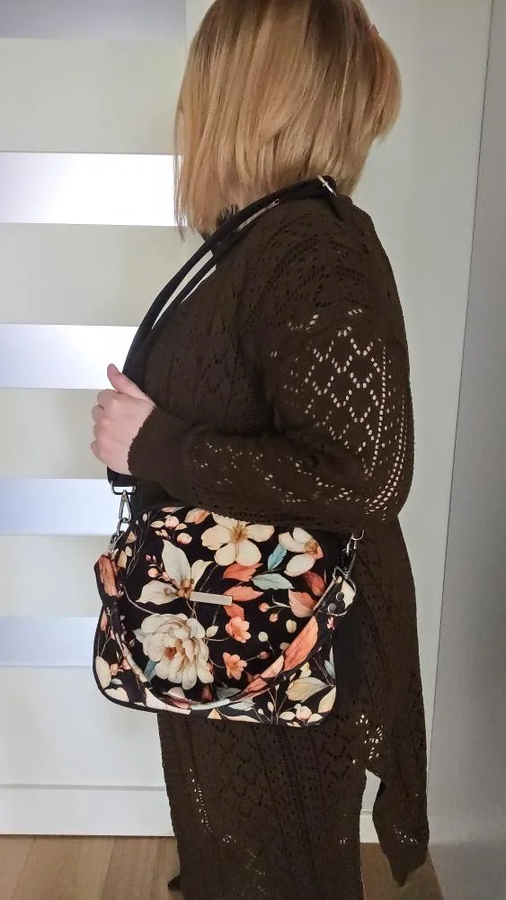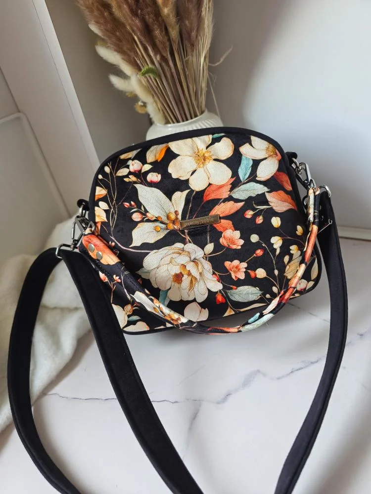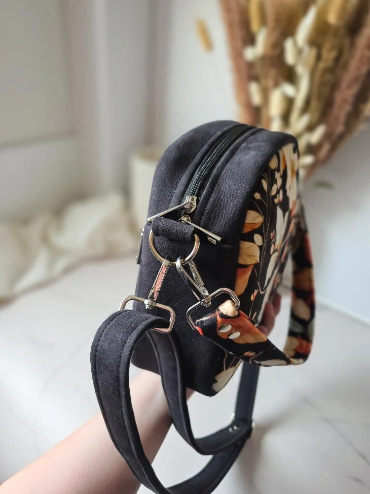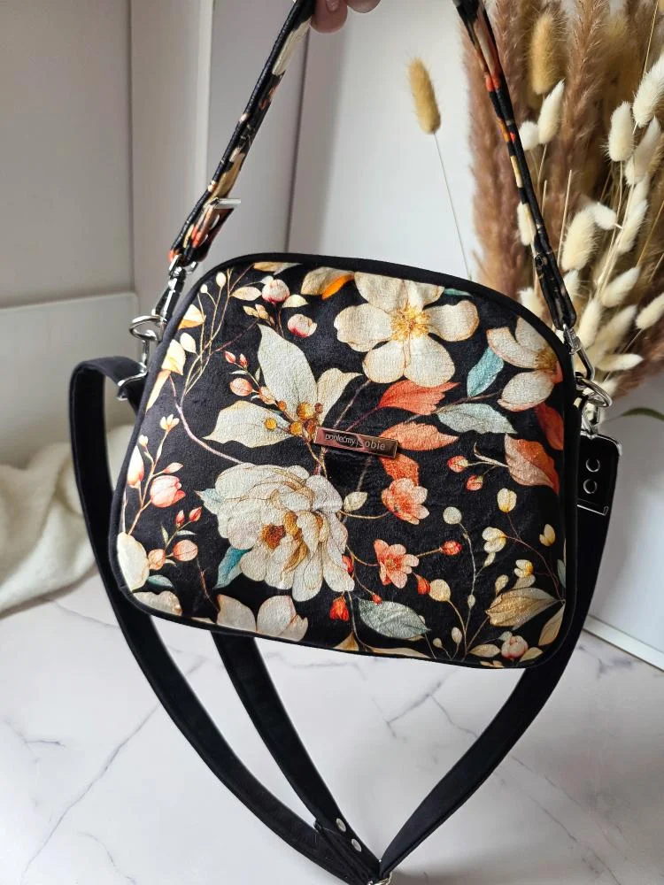 Torebka została uszyta z czarnej tkaniny nubukowej i tkaniny tapicerskiej (przód).