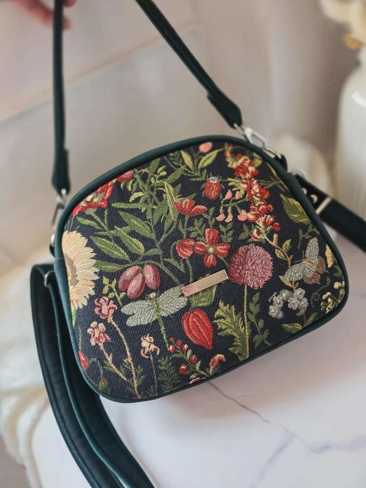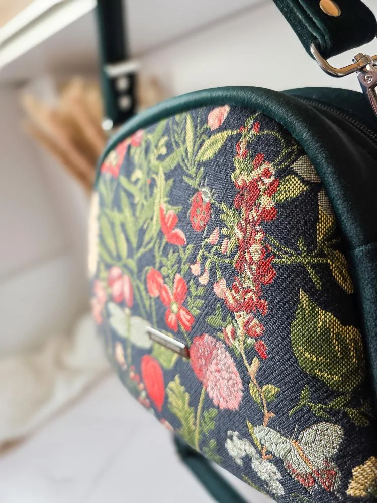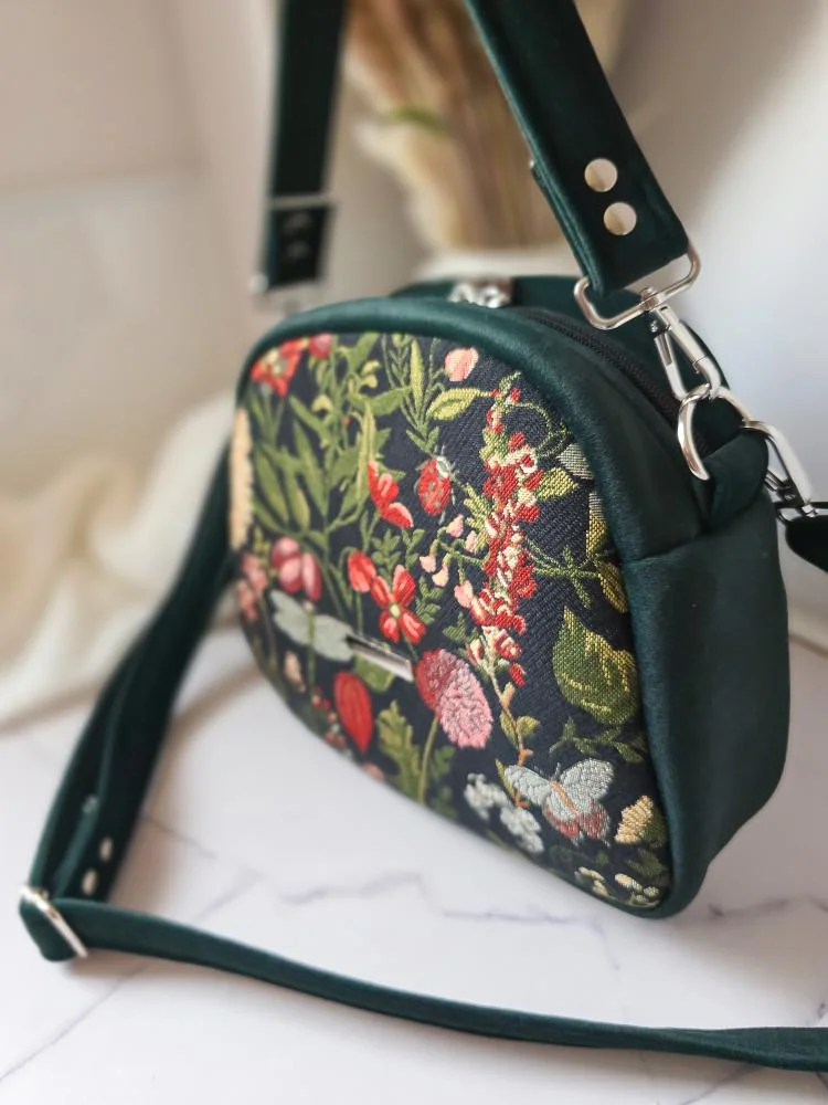 Torebka została uszyta z ciemnozielonej tkaniny tapicerskiej i tkaniny gobelinowej we wzór (przód).